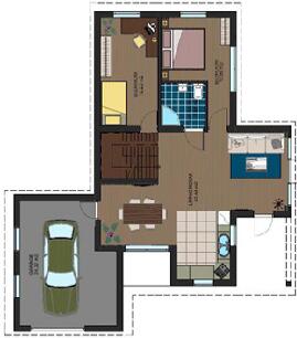 此款木屋設計為兩層樓,木房屋總面積100米²;一個外部車庫加住宅四室和廚房住宅。一樓的生活空間有53平方米,二樓47米²,車庫-